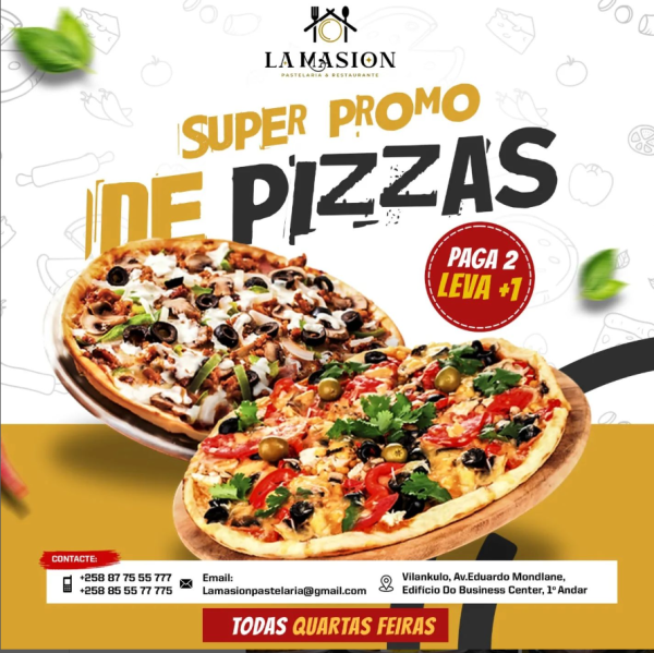 - Aproveite nossa irresistível promoção de Pizza: pague 2 e leve + 1! Uma delícia triplicada para saborear. Não perca, peça a sua agora!