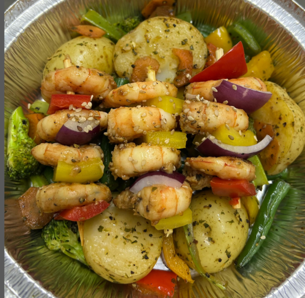Espetadas de camarão e vegetais salteados. Faça o seu pedido!